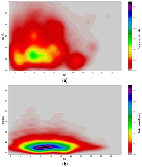 The rationale for creating such a landscape is not to directly assess the protein dynamics of c-MYC1-88 from it (MCMC simulations do not reflect a temporal progression of a system, but rather give an overview of the range of possible conformational spaces available to the protein (Figures S3 and S4). A comparison of the MCMC and MD conformational landscapes results calculated in the same manner shows that the two methods create structures that inhabit an extensively overlapping landscape, especially when referring to the most compact conformations. Furthermore, using Sα—a metric of α-helical content similarity—as a conformational descriptor against the Rg, allows for investigation into the helical sampling of the MD landscape; the MD simulation explores a wide range of helical content, similar to the range explored by the MCMC landscape (Figure 4).