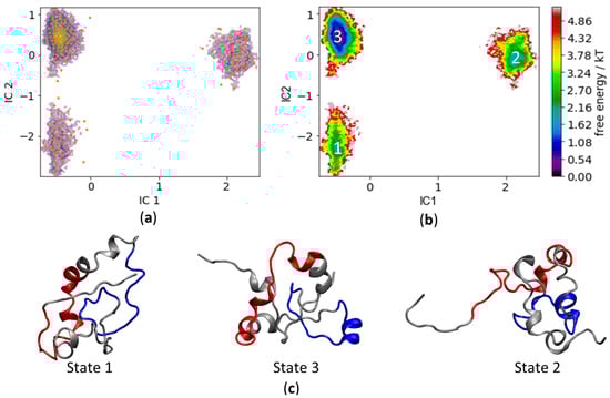The three conformational basins identified by TICA correspond to three metastable states. K-means clustering can now be used to discretize the IC landscape to allocate trajectory structures to their respective k-means clusters, which allows the clustered microstates to be assigned to the three metastable macrostates. The Perron-cluster cluster analysis (PCCA++) method was used to extract the representative structures for each macrostate.