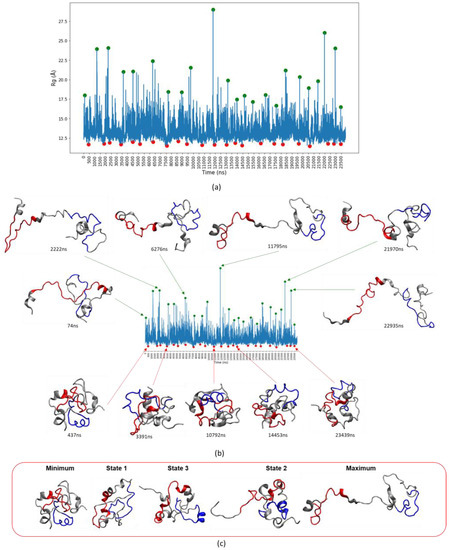 For IDPs such as c-MYC1-88, it is still crucial to assess the highest amplitude motions because they usually correspond to rarer but still important protein conformations. As previously established, PCA is not a useful conformational space descriptor method, and a new strategy must be implemented. The strategy presented here goes back to basic geometric measures, in this case Rg, to track minima and maxima over time (Figure 7a).