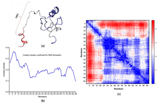 (a) Contact activity data superimposed on a representative structure. (b) Linear graph containing the contact residue coefficient for root mean square fluctuation per residue. (c) Heat map identifying active versus inactive protein regions according to their contact activity coefficient—blue identifies areas of stability and red identifies areas of increased activity.