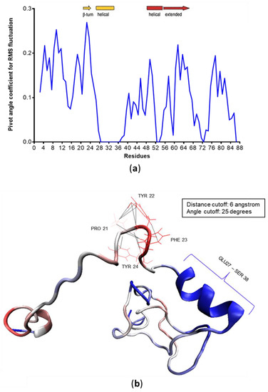 (a) Linear data for the pivot angle coefficient (residues involved in the formation of pivot angles). The same data are mapped onto a representative structure (b). The most prominent pivot angle is the β-turn formed by amino acids 20 to 24, which corresponds to the extended region identified by NMR [49].