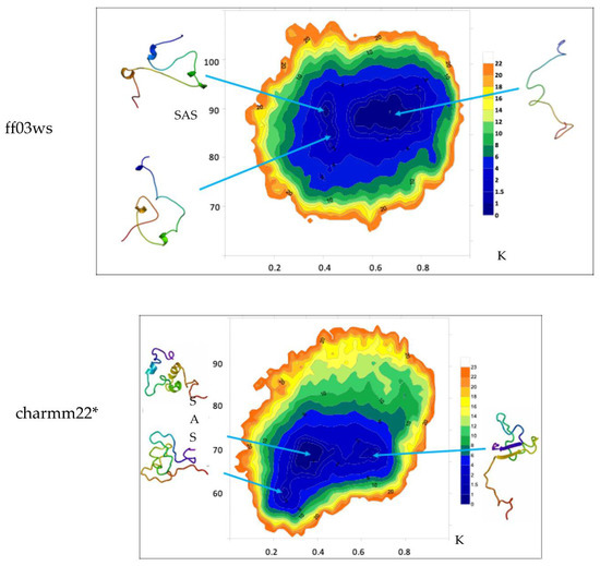The ff03ws FEL displays three populated basins. The extraction of a representative structure from each basin by cluster analysis shows that the largest population includes conformations that feature high solvent accessibility and extended shape. Instead, the other two smaller populations contain conformations with similar K values but different solvent accessibility. However, the representative structures look pretty similar with a shape at halfway between globular and extended. The same analysis on the charmm22* ensemble shows two main populations with similar SAS area but two different K values. Between them, the population with a higher K value includes conformations that appear more extended than those in the lower K value region that instead encompasses rather compact states. Noteworthy, a third smaller population with a K value similar to the one characterizing the population with compact structures, but differing in SAS area, features compact states as well. As a result, here the two populations distributed along the K axis correspond to conformations differing in terms of shape, whereas the two populations along SAS axis include similar shape conformations.