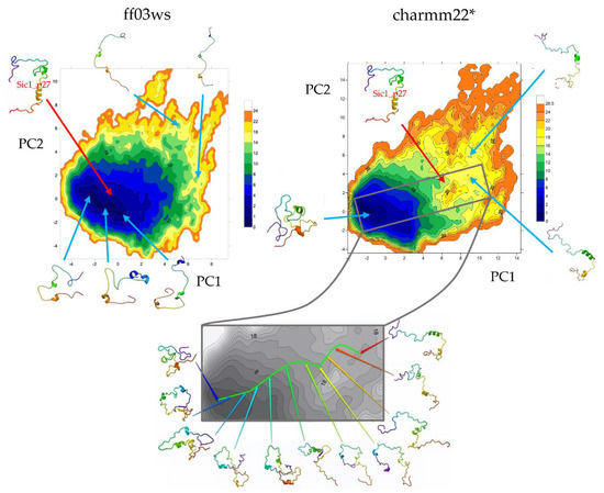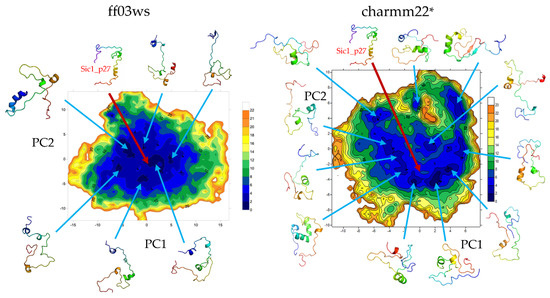 The FEL on the first two PCs of the ED space included about 40% of the variance in both the conformational ensembles. In the ff03ws FEL the minima were mainly populated by elongated conformations. One of them included conformations similar to the structure of Sic1 modeled on the p27 KID in the bound state (Sic1_p27) that indeed had a projection in proximity of that minimum. In the charmm22* FEL the minima were instead mainly populated by globular or partially globular states. According to this, the Sic1_p27 projection was located in a local minimum.