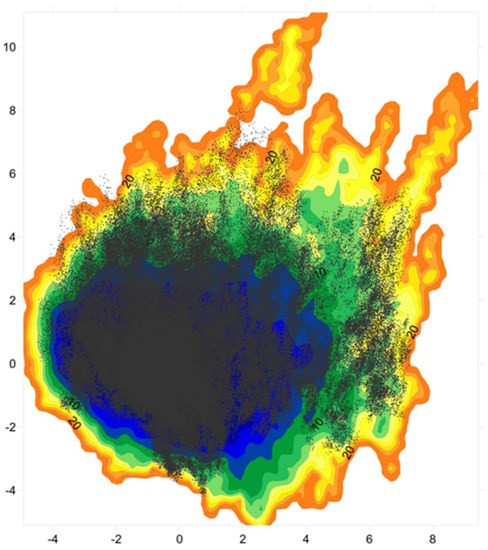 Projection of the 300 K conformational ensemble on the PC1/PC2 WHIM descriptors space calculated on the conformational ensemble at 400 K.