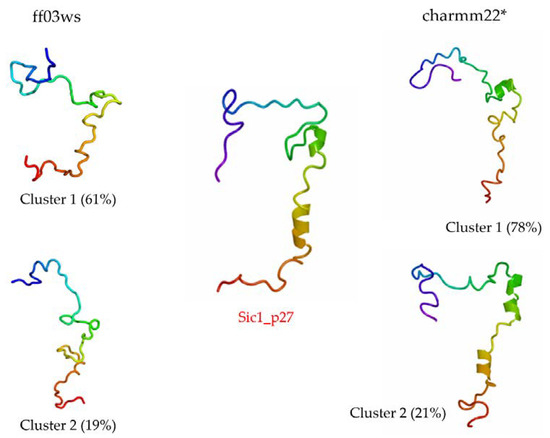 A further confirmation in this direction comes from the cluster analysis performed on the structures with a RMSD value below 1 nm from Sic1_p27. The centrotypes of the first two most populated clusters show structures that in the case of the ff03ws ensemble were quite close to Sic1_p27 or, in case of the charmm22* ensemble, were impressively similar to Sic1_p27.