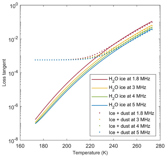 Loss tangent of pure water ice and of an ice/dust mixture with a volumetric fraction of dust equal to 0.1 as a function of temperature, for the four Mars Orbiter Subsurface Investigation Radar (MOSIR) operating frequencies. The loss tangent of water ice is computed according to formulas presented in [47], while the permittivity of volcanic rock in Table 1 has been used to represent that of dust. The effective permittivity of the ice/dust mixture has been obtained through Equation (6).