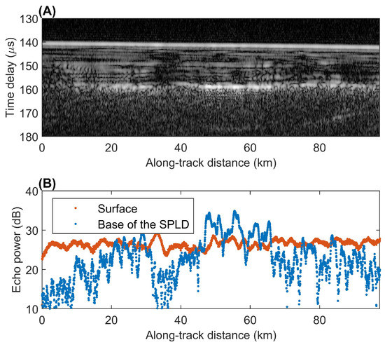 The identification of liquid water on Mars through radar sounding is thus based on the detection of areas of strong subsurface echoes. Indeed, in the case of [32] it was found that echoes coming from below the polar ice sheet at a depth of ≈1.5 km were stronger than surface echoes by several dB, as shown in Figure 2 below.