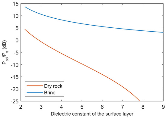 Values of computed according to Equation (7) for a bedrock consisting of dry volcanic rock and a body of subglacial brine, by varying the dielectric constant value of the surface layer between that of CO ice and that of dense volcanic rock, and by assuming that there is no signal attenuation due to dielectric losses in the surface material (see text for details).
