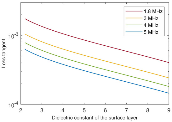 Values of surface material loss tangent that result in according to Equation (7), for a basal relative permittivity value at the upper end of the range for brines and a time delay of the subsurface echo of 160 s, as in [32] (see text for details).