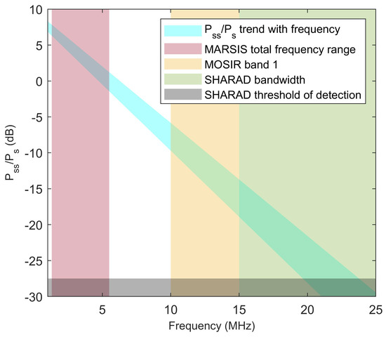 Estimate of the ratio of subsurface to surface echo power over the bright reflector in [32] as a function of frequency, extrapolated from MARSIS data. The light blue diagonal strip represents the area of the best fit to the data extending to the 90% confidence level. The colored rectangles highlight the operation bands of different radar instruments.