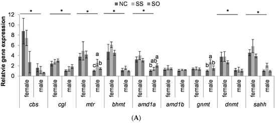Gene expression levels in female liver tissue were not significantly different between groups. Methionine synthase (mtr) expression was higher in male liver tissue when the fish were fed Se-supplemented diets, with the highest expression in the SS treatment (Figure 3A). In addition, in male liver tissue, the expression of adenosylmethionine decarboxylase 1a (amd1a) was higher in SO compared to NC and that of glycine N-methyltransferase (gnmt) in SS compared to the other two dietary treatments. Except for adenosylmethionine decarboxylase 1b (amd1b) and gnmt, the expression of the 1C metabolism-related genes analyzed was higher in the females than in the males.