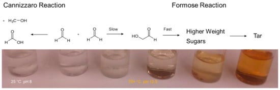 When heated under alkaline conditions formaldehyde solutions turn yellow in color. This yellowing occurs due to the production of sugars from formaldehyde [4]. As the reaction proceeds the solution browns, which signals formaldehyde has been used up and some sugars have degraded into tar (Figure 1). The Cannizzaro reaction, a base-catalyzed disproportionation reaction, converts formaldehyde (C0) into formic acid (C2+) and methanol (C2−), also occurs concurrently [23,24,25,26,27,28,29].