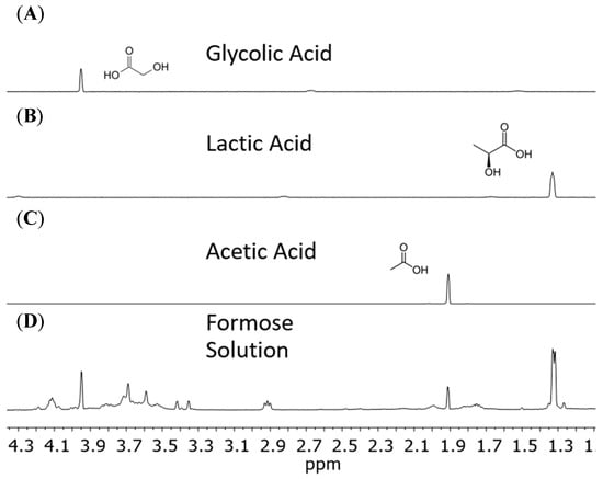 Standards of carboxylic acids compared to a formose solution using proton NMR. Standards are at 10 mM in a pH 7.5 solution with DSS and D2O. Spectra (A–C) represent standard glycolic acid, lactic acid, and acetic acid, respectively. The magnified spectrum (D) represents a formose reaction run at pH 12.5 and 120 °C catalyzed using Ca2+. Formose solution was titrated with HCl down to a pH of 7.5 after autoclaving and cooling down to room temperature.