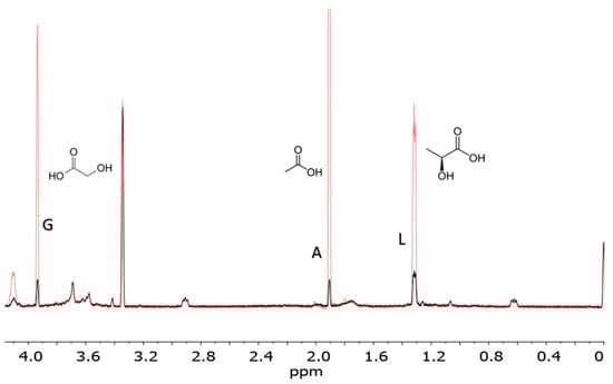 Carboxylic acids spiked into a formose solution. The red spectral lines represent the spiked-in set, and include added lactic acid, glycolic acid, and acetic acid to a formose solution. The black spectral lines represent the formose products with no additional carboxylic acids spiked-in. Spectra were measured from a formose reaction run at pH 12.5 and 120 °C catalyzed using Ca2+.The abbreviations G, A, and L stand for glycolic acid, acetic acid, and lactic acid, respectively. This reaction was performed at pH 12.5, 120 °C, the product solution was cooled and titrated to pH 7.5 before NMR analysis.