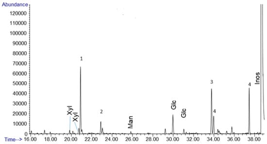 Gas chromatogram for an uncatalyzed formose reaction. 1 M formaldehyde w/0.5 M methanol at pH 12.5 heated at 80 °C for 1 h. Glc, Man, and Xyl, represent glucose, mannose, and xylose, respectively. Peaks labeled 1 and 2 are organic acids coeluting with xylose, likely including saccharinic acids. Peak 3 is sorbitol and peak 4 is myo-inositol, these were formed from the inositol standard, not the formose reaction.