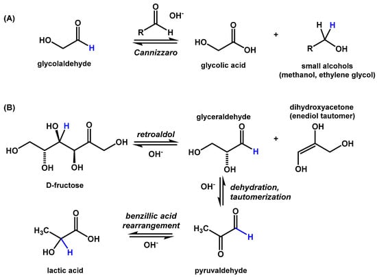 Within studies of biomass conversion, the formation of carboxylic acids, including lactic acid, glycolic acid, and acetic acid, has been observed in high-temperature alkaline reactions starting from glucose [30], fructose [31,32], pyruvaldehyde [32,33], and glycolaldehyde [34]. Glycolic acid is expected to be generated through a Cannizzaro reaction of glycolaldehyde with formaldehyde (or other small aldehydes, Figure 5A). Lactic acid is likely generated as a result of a benzillic rearrangement of pyruvaldehyde that was generated through the dehydration and tautomerization of glyceraldehyde (Figure 5B). Glyceraldehyde is produced both by the reaction of glycolaldehyde with formaldehyde in the formose reaction, and the retro-aldol breakdown of higher sugars such as fructose.