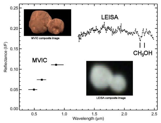 Arrokoth is a fused binary body with combined length of 36 km and equivalent diameter of 18 km, and an estimated mean density of several hundred kg/m3 [32,33]. The surface of Arrokoth has a near-uniform orange-red color, and its near-infrared spectrum, obtained with the New Horizons LEISA instrument, shows absorption bands at 2.1, 2.27 and 2.33 μm identified as frozen methanol (CH3OH) (Figure 1). The presence of H2O ice on its surface is suggested by a shallow absorption band at 2.0 μm, but the band may be spurious, and the evidence for H2O is therefore ambiguous [13]. Water ice is expected on Arrokoth and all other KBOs, and has been detected spectroscopically on some, but not all, of the objects for which appropriate data exist. However, such data only exist for larger, brighter members of the more excited populations, not small cold classical KBOs like Arrokoth [34,35]. Both the steep slope of the reflectance spectrum of Arrokoth and the CH3OH bands are closely similar to those characteristics of Centaur 5145 Pholus, but Pholus also shows prominent H2O bands [36]. Another KBO, 2002VE95, a resonant plutino, also shows prominent CH3OH and H2O absorption bands [37], suggesting that the apparent absence of H2O on the surface of Arrokoth is anomalous. Whether or not ice is present on the surface, an opaque patina of space weathering is likely on these small bodies, and if present, may mask diagnostic spectral features of H2O and other possible components.
