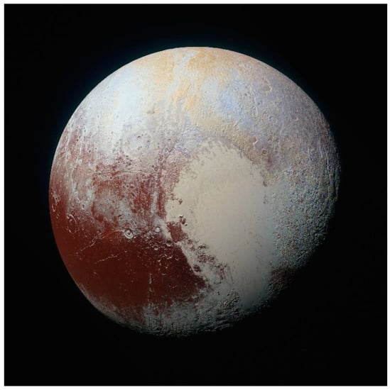 - Stern, S.A.; Bagenal, F.; Ennico, K.; Gladstone, G.R.; Grundy, W.M.; McKinnon, W.B.; Moore, J.M.; Olkin, C.B.; Spencer, J.R.; Weaver, H.A.; et al. The Pluto system: Initial results from its exploration by New Horizons. Science 2015, 350, 1815. [Google Scholar] [CrossRef]