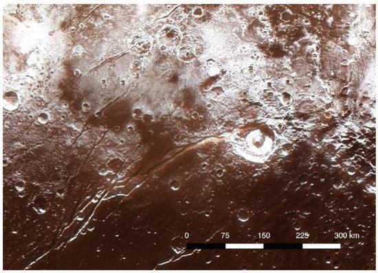Pluto’s variegated surface consists of a suite of highly volatile ices (N2, CO, CH4) that were originally found by near-infrared spectroscopy from ground-based telescopes [42] (Figure 2). These components were confirmed by infrared spectroscopy by the New Horizons spacecraft, and exposures of H2O ice and small amounts of frozen C2H6 and CH3OH were also found [10,43,44]. A non-volatile material on Pluto’s surface appears to consist of complex organic molecular material deposited from the atmosphere (see below) and produced directly on the surface by photolysis and radiolysis of the surface ices that contain the hydrocarbons CH4 and C2H6 [44]. Pluto’s variegated surface is shown in the color-enhanced image from New Horizons (Figure 3). Red-orange-colored H2O ice carries the spectral signature of NH3 hydrate, or possibly an ammoniated salt that is thought to have emerged from one or more subsurface reservoirs in episodes of cryovolcanism [45,46] (Figure 4). Beyond the surface expressions of H2O ice, there is no direct evidence of subsurface liquid water in Pluto’s interior, but the case has been made by various investigators for the existence of a global ocean at some time in the planet’s history, e.g., [47] on geodynamical considerations.