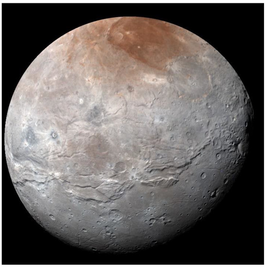 Images and near-infrared spectra of Charon obtained during the flyby of New Horizons in 2015 [10,45] have corroborated previous detections of NH3 or an ammoniated material on the surface found from ground-based near-infrared spectroscopy [64,65,66]. In addition, the spacecraft data have shown that the north polar region is tinted with an orange pigment [11] (Figure 5). The polar coloration can be explained by photolysis of CH4 deposited there during the alternating long-term darkness of each of Charon’s polar regions resulting from the high obliquity of the Pluto–Charon orbit. Methane gas is escaping from Pluto’s atmosphere [4], and a fraction of the streaming gas encounters Charon where it is cold-trapped on the polar region in darkness. That frozen CH4 is later photolyzed by solar Lyman-α radiation back-scattered by interplanetary hydrogen, producing a colored refractory residue (tholin). Unprocessed CH4 escapes Charon’s surface as direct sunlight is slowly restored during the orbital cycle, and the process is repeated for the south polar region (which is currently in darkness) over the 248-year orbital period of Pluto and Charon around the Sun [11].