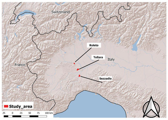 Alessandria Province (Italy), the three study areas (Roleto, Tollara, and Sezzadio) are marked in red.