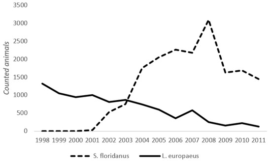 Dynamics of L. europaeus and S. floridanus in a protected area located in Alessandria Province during the period from 1998–2011.