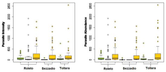 Nematode prevalence (P—percentage of infected animals), intensity (I—mean number of parasites per infected animals), and abundance (A—mean number of parasites per examined host) were computed. Data were analyzed using R 3.5.0 software [60]. Descriptive statistics were used to characterize variations in the main epidemiological indices among the three study areas.