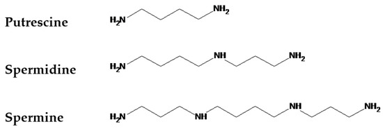 Polyamines (PAs) are polycationic compounds of low molecular weight, which have been proposed as a new category of plant growth regulators involved in a large spectrum of physiological processes; moreover, they have been shown to be an integral part of plant stress response [1,2,3,4]. The most common PAs in living organisms are putrescine, spermidine and spermine [5]. These are aliphatic compounds, among which the simplest—putrescine (Put)—is a diamine, spermidine (Spd)—a triamine, and spermine (Spm)—a tetraamine (Figure 1).