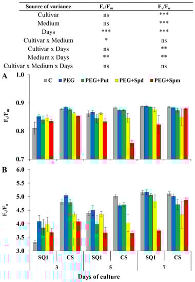 Chlorophyll a fluorescence parameters Fv/Fm (A) and Fv/Fo (B) in leaves of two wheat cultivars—CS and SQ1—on the 3rd, 5th and 7th day of PEG-induced osmotic stress and supplementation with PAs, resulting in a total of five treatments: Control, PEG, PEG+Put, PEG+Spd and PEG + Spm. The results of multiple factor analysis of variance (ANOVA) are presented in the table above the chart. The sources of variance of the measured parameters were as follows: two cultivars, five media, three measurement days, and their interactions. *, **, ***, significant at p ≤ 0.05, 0.01, 0.001, respectively; ns, not significant. Each bar represents a mean of 6 replicates ± SE.