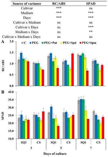 The presence of PEG in the medium did not have any influence on this parameter. On the 5th treatment day, the most visible effect on RC/ABS was observed in the presence of spermine for both cultivars, though it was an increase for CS and a decrease for SQ1. Exogenous application of PAs to the hydroponic medium caused significant changes in the chlorophyll content, measured in SPAD units. The pattern of changes was similar to those of the previously described parameter RC/ABS (Figure 4B). The effect of spermine was different from other PAs, control and PEG.