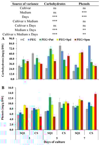 Carbohydrates (A) and phenols (B) in leaves of two wheat cultivars—CS and SQ1—on the 3rd, 5th and 7th day of PEG-induced osmotic stress and supplementation with PAs, resulting in a total of five treatments: Control, PEG, PEG + Put, PEG + Spd and PEG + Spm. The results of multiple factor analysis of variance (ANOVA) are presented in the table above the chart. The sources of variance of the measured parameters were as follows: two cultivars, five media, three measurement days, and their interactions. *, **, ***, significant at p ≤ 0.05, 0.01, 0.001, respectively; ns, not significant. Each bar represents a mean of 3 replicates ± SE.