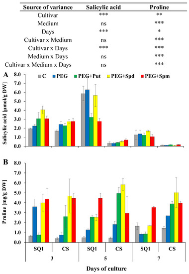 Salicylic acid (A) and proline (B) in leaves of two wheat cultivars—CS and SQ1—on the 3rd, 5th and 7th day of PEG-induced osmotic stress and supplementation with PAs, resulting in a total of five treatments: Control, PEG, PEG + Put, PEG + Spd and PEG + Spm. The results of multiple factor analysis of variance (ANOVA) are presented in the table above the chart. The sources of variance of the measured parameters were as follows: two cultivars, five media, three measurement days, and their interactions. *, **, ***, significant at p ≤ 0.05, 0.01, 0.001, respectively; ns, not significant. Each bar represents a mean of 3 replicates ± SE.