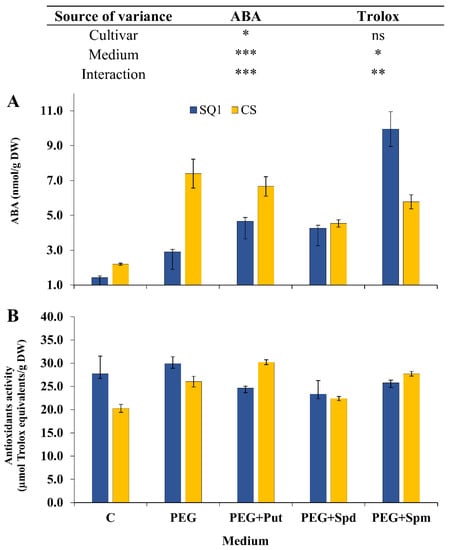 ABA content in seedling leaves is generally considered as a good indicator of stress tolerance. In our experiment ABA content was measured only at the end of stress treatment, i.e., on the 7th day. It depended significantly on the cultivar, medium and their interaction (Figure 7A). In SQ1 osmotic stress generated by PEG treatment caused a two-fold increase in ABA content and a further increase was observed in the presence of putrescine and spermidine in the medium (3–4 fold) as well as in the presence of spermine (ca. 9-fold compared to control). In the more resistant CS, PEG treatment caused a substantial increase in ABA content (3.5-fold) compared to control. Medium supplementation with PAs maintained this increase—spermidine to the least extent.