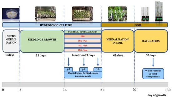 Preparation of grains was performed according to the procedure described in our previous papers [39,40]. In total, 330 germinating seedlings of CS and SQ1 cultivars were grown in 30 pots (11 plants per pot), each containing 30 mL half-strength Hoagland solution, and maintained in a hydroponic culture in a phytotronic greenhouse for 11 days. The hydroponic solution was aerated by air pumps. The pump flow was set to gentle aeration, the roots were immersed in the medium and the solution did not splash out, preventing a large loss of the culture medium. Every day, the hydroponic medium was supplemented with fresh medium, and every week it was completely exchanged with fresh medium. After 11 days of growth in control (C) conditions (25 °C, 16 h photoperiod, 400 μmol/m2 s light intensity), when the fourth leaf was fully expanded, seedlings were randomly divided into five groups: (1) C—control seedlings, grown only in half-strength Hoagland solution; (2) PEG—grown in C + PEG (−0.75 MPa); (3) PEG + Put; (4) PEG + Spd; and (5) PEG + Spm. PEG 6000 was used as it is frequently applied in physiological research to simulate osmotic stress. An 18% PEG solution was prepared to obtain PEG medium with an osmotic pressure of −0.75 MPa. PEG 6000 (180 g) was dissolved in 820 g of half-strength Hoagland’s medium and mixed on a magnetic stirrer with heating until PEG was completely dissolved. As regards PAs, 0.088 g of putrescine, 0.145 g of spermidine and 0.202 g of spermine were weighed and dissolved separately in 1 L of 18% PEG medium to obtain the necessary PA concentration. The pH of all solutions was adjusted to 6.0 and the seedlings were maintained in these media for the next 7 days. The concentration of polyamines was 1 mmol/L. At two-day intervals, the cultures were supplemented with 15 mL fresh solution. At the end of the treatment, i.e., after 7 days, one seedling from each pot (in three replicates) was transferred to the soil and placed in vernalization conditions (+4 °C, 8 h photoperiod) for 7 weeks. After that plants grew to maturity stage in optimal glasshouse conditions (25 °C, 16 h photoperiod). The scheme of the experiment is presented in Figure 8.
