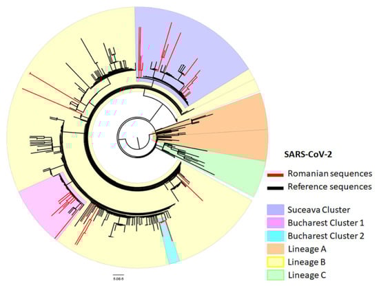 The subtype analysis of the 25 SARS-CoV-2 sequences generated in this study indicated that all Romanian sequences belong to lineage B. Furthermore, all the SARS-CoV-2 sequences corresponding to viral strains circulating in the BMA were classified as subtype B.1.1, whereas the sequences from the Suceava county outbreak were assigned as B.1.5.