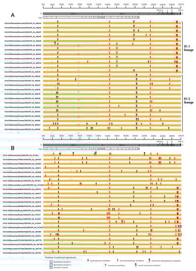 Mutational profile of the forty-nine Romanian SARS-CoV2 sequences. (A) Mutations present in the sequences generated in our study, depicted as either a black (synonymous mutation) or red pin (non-synonymous mutation), aligned using the 045512.2 NCBI reference sequence. Novel mutations were signposted with a black asterisk. Putative mutational signatures of observed clusters were highlighted as follows: pink for Bucharest Cluster 1, blue for Bucharest Cluster 2 and purple for Suceava Cluster. (B) The mutational profile of the other Romanian sequences retrieved from GISAID presented additional nonsense mutations (red pin with a hollowed center).
