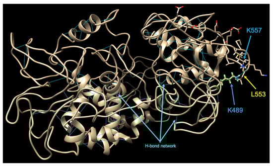 C-I-Tasser model of Nsp2—local representation of tertiary structure (using Chimera) around the novel K489E mutation. The possible effect of K489E mutation in Nsp2: with cyan lines are represented the H-bonds network in the Nsp2 model. The amino acids in the proximity of K489 are represented as sidechains. Hydrogens are represented on both K489 and K557 Lysins and the amino acids involved in H-bond interactions with K489 and L553 are shown.