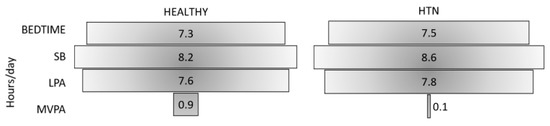 The subjective and objective benefits of regular MVPA on sleep are well-known [29], as is the strong association between short sleep duration, poor sleep quality, and cardiometabolic risk factors such as HTN and overweight/obesity [25,26]. Results of the present study seemed to confirm the aforementioned association. Although both groups spent similar time in bed (7.4–7.5 h/day, Table 1, Figure 1), the HTN group showed poorer sleep quality than the HEALTHY group due to significantly shorter sleep time per day (HEALTHY = 6.7 h vs. HTN = 6.4 h) and worse sleep efficiency (HEALTHY = 92% vs. HTN = 84%). Indeed, HTN participants did not reach 85% sleep efficiency, which is considered to be healthy [26,37,46]. The absence of MVPA and bad sleep quality, along with a moderate risk for OSA as shown by the STOP-Bang Questionnaire, could be the key factors explaining the unhealthy status of HTN participants, presenting with physical, clinical, and physiological differences compared with HEALTHY participants [40,42]. In this sense, our results were consistent with previous studies reporting that a high level of exercise was associated with reduced odds of moderate-severe OSA, which in turn was associated with increased all-cause mortality [38,47].
