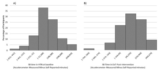Distribution of the time difference between accelerometer-measured and self-reported sedentary behavior (SB) in (A) the primary hypertension (HTN) sample at baseline and (B) the exercise training subgroup (ExT) at post-intervention.