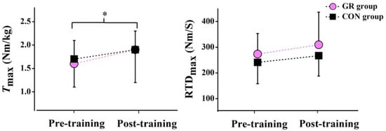 | Tmax (Nm/kg) | 1.6 ± 0.5 | 1.9 ± 0.7 * | 27.5% | 1.7 ± 0.4 | 1.9 ± 0.4 * | 10.4% | 0.005 | 0.843 | 0.356 |