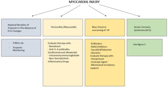 As evidenced by several studies, it seems that the main cause of myocardial damage is myocardial damage in the absence of epicardial coronary artery thrombosis, although it is possible that patients with COVID-19 may still have concomitant acute coronary syndrome. A correct differential diagnosis between the various causes of myocardial injury is therefore essential in patients with myocardial damage, limiting fibrinolysis or coronary angiography to certain cases of ST-elevation myocardial infarction (STEMI) [57,58,59,60] (Figure 2, Figure 3 and Figure 4).