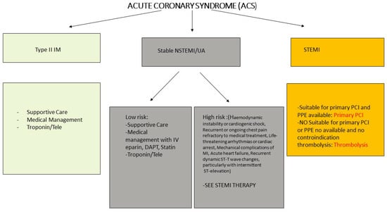 SARS-CoV-2 and ACS management. Type 2 myocardial infarction (type II IM); non-ST segment elevation myocardial infarction (NSTEMI); unstable angina (UA); ST elevation myocardial infarction (STEMI); percutaneous coronary intervention (PCI); dual antiplatelet therapy (DAPT); personal protective equipment (PPE).