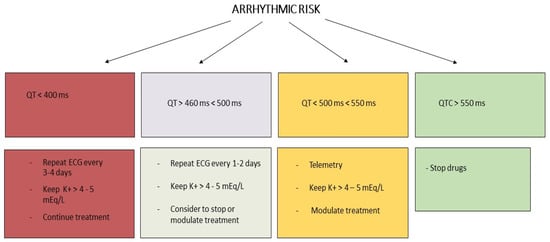 It is important to pay attention to the particular clinical situation, like diarrhea, which may lead to hypokalemia, which may influence the QTc interval. Moreover, all unnecessary QT prolonging drugs should be stopped. If QTc is higher than 500 ms or if QTc increases by ≥60 ms from baseline, then the safety of QT prolonging antiviral drugs should be reviewed, and serum potassium levels should be kept at >4.5 mEq/L; fever should be aggressively treated with paracetamol.