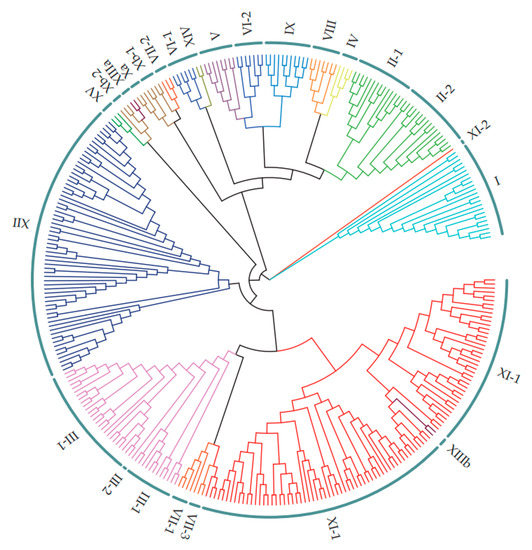 Phylogenetic analysis of LRR-RLKs retrieved in M. truncatula. The coding sequences for 329 MtLRR-RLKs were aligned by clusterW and the phylogenetic tree was constructed using MEGA 7.0 by the neighbor-joining method with 1000 bootstrap replicates. All MtLRR-RLKs were classified into 15 distinct groups and 24 subgroups based on the nomenclature of Arabidopsis LRR-RLKs (from I to XV) and were distinguished by different colors.