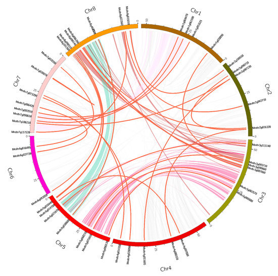 The Circos figure for chromosome locations with MtLRR-RLK segmental duplication links. The red lines indicate segmented duplicated gene pairs.