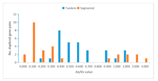 The distribution of Ka/Ks values in all tandem and segmental duplicated MtLRR-RLKs. The Ka/Ks value of each duplicated gene pair was calculated by KaKs_Calculator2.0.