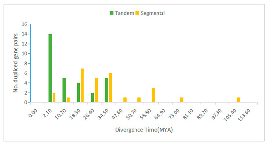 Segmental duplications lead to duplicated genes through polyploidy, followed by chromosome rearrangements. We found that the M. truncatula genome contains segment replication events. Through MCScanX analysis, a total of 27 pairs of segmental duplications in the MtLRR-RLK gene family were found to be colinearly related, and for some segmental duplications, three LRR-RLK members were colinearly related (Figure 3, Table S4). The nonsynonymous (Ka) and synonymous (Ks) substitution rate values between these duplicated events were calculated via KaKs_Calculator. The Ka/Ks information is listed in Table S5. A Ka/Ks ratio equal to one indicates a ‘‘neutral mutation or no selection’’, and a Ka/Ks ratio less than one indicates ‘‘negative or purifying selection’’, whereas a Ka/Ks ratio greater than one indicates ‘‘positive or Darwinian selection’’ [79]. The distribution analysis of the Ka/Ks values suggested that all the Ka/Ks values of the tandem duplicated gene pairs ranged from 0 to 1.237, with one peak at 0.40–0.50, and all the Ka/Ks values of segmental duplicated gene pairs ranged from 0 to 3.582, with one peak at 0.10–0.20. There were 4 segmental event gene pairs in the range of 0.3 to 0.4 (Figure 4). Approximately 90% of the tandem duplicated gene pairs have a Ka/Ks value of less than 1, indicating that the selection pressure is negative (Figure 4). Moreover, we also calculated the divergence time (MYA) of duplication events. Forty-seven percent of the tandem duplicated gene pairs were determined to have occurred approximately 2.11 and 0.2 million years ago (MYA). In addition, a single TD event was calculated to occur at approximately 42.57 MYA. The date of segmental duplicated events suggested that all the approximate dates ranged from 4.44 to 113.27 MYA, with a peak at 18.30–26.40 and another at 34.50–42.60 MYA (Figure 5, Table S5).