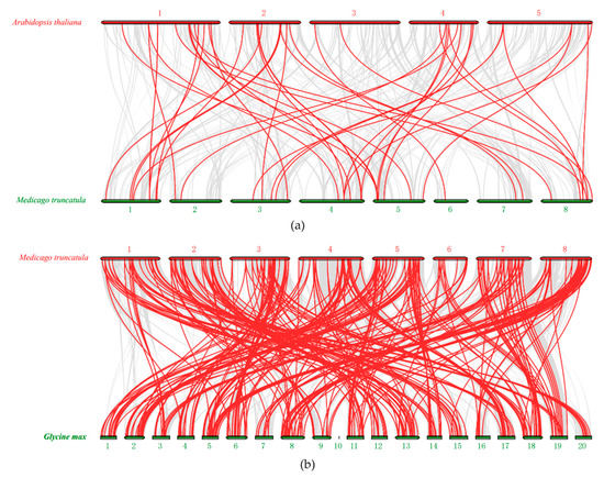 In addition, we analyzed the synteny of LRR-RLK genes between the M. truncatula, Arabidopsis and soybean genomes in this study. By comparing the whole genomes of M. truncatula and Arabidopsis via MCScanX to analyze the synteny between the two species, we identified a total of 43 gene pairs with synteny (Figure 6a, Table S6). More than 300 gene pairs were found to be collinearly related between M. truncatula and soybean (Figure 6b, Table S6). The collinear complexity of M. truncatula and soybean is much greater than that between M. truncatula and Arabidopsis. Together, these results indicated that M. truncatula and Arabidopsis were relatively distantly related while were closer with soybean; the genes of M. truncatula in the same family were more closely related to those of soybean than to those of Arabidopsis.