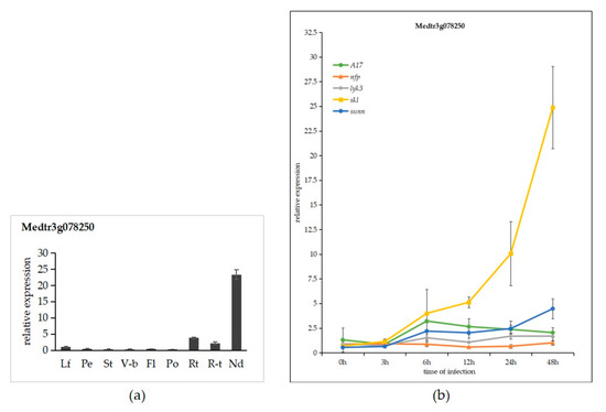 To identify the expression profile of these genes expressed specifically or highly in roots, nodules, and skl mutant after 12 h S. meliloti infection (Figure 8 and Figure 9), we determined the expression levels of one of the MtLRR-RLK genes (Figure 7). The expression level of Medtr3g078250 in skl mutant was much higher than in WT A17, sunn that involved in autoregulation of nodulation signal [73], lyk3 and nfp, particularly in 12,24 and 48 hpi, which was similar with RNA-seq expression profile. In the skl mutants, the expression of Medtr3g078250, expressed specifically in root and nodules, was significantly increased starting 12 hpi. It was noted that the expression level in sunn was more equivalent or lower than that in WT A17 in 3,6,12,24 hpi, while it was obviously higher in 48 hpi (Figure 7b).
