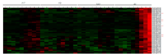 Expression profile of the 36 representative genes are highly expressed after rhizobium inoculation 12 h in mutant skl (http://pages.discovery.wisc.edu/~sroy/Medicago_symbiosis_transcriptome/query.php). Red arrows indicate genes that highly expressed in root, nodule and skl mutant under rhizobium infection.